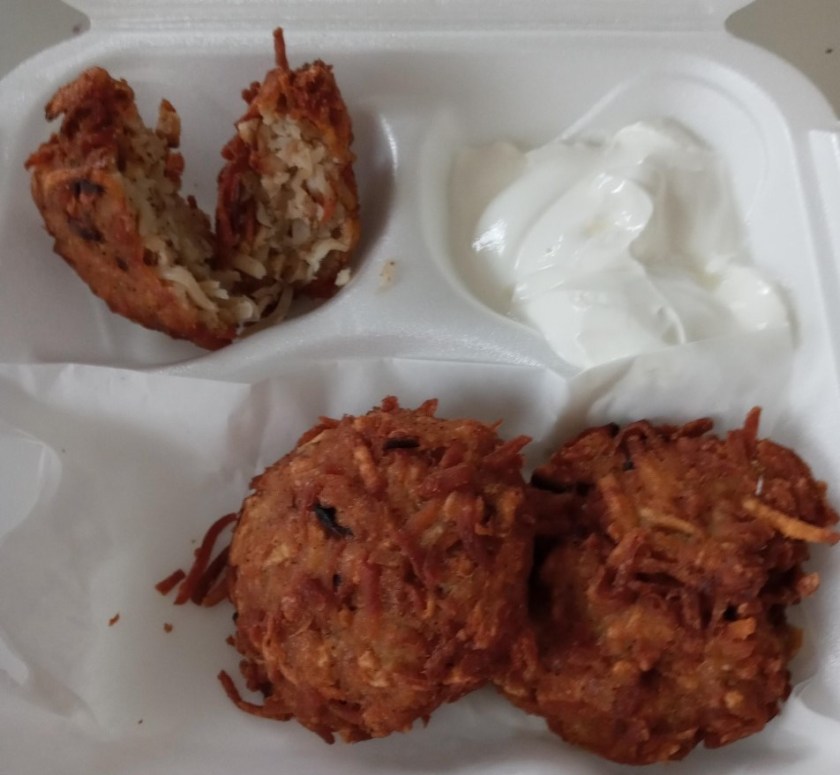We started out with an order of three potato latkes ($5), served with sour cream. You can also choose applesauce instead of sour cream, but we have applesauce at home. These weren’t flat pancakes like most latkes I’ve had, but thick fritters that were still hot when we got them home, with perfect crispy exteriors and soft, savory insides. I tasted a lot of onion, garlic, and pepper. If you like fries and home fries, do yourself a favor (and a flavor) and try some potato latkes some time. Ideally these.