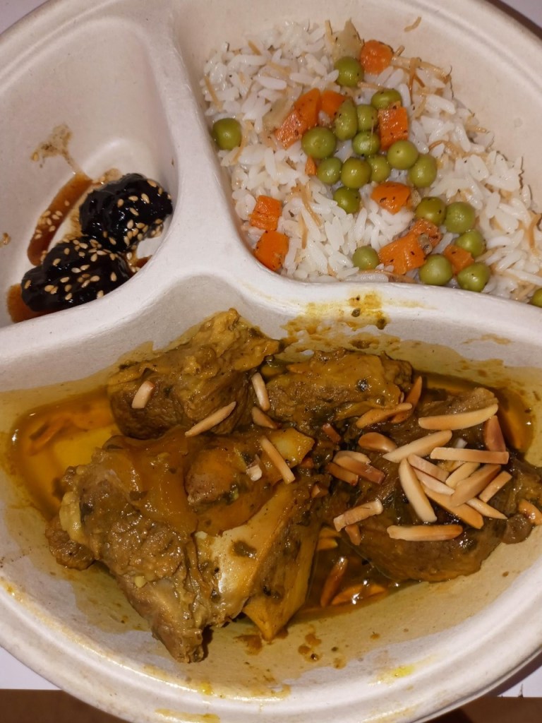The menu at Tajine Xpress isn’t huge, but now I’ve covered the two dishes that sounded the best to me: the lamb couscous (available Friday through Sunday only) and the beef with prunes tajine. I would recommend both of those for sure. As I said, I wish you got more meat with both of dishes, especially because the meats are so good. I don’t love that round bread, and I’m wondering if the other side order options of fries and beans would be better than the rice I got today. I think they would have to be. I just figured fries would be cold by the time I got them home, but if you go and try the fries, let me know how they were!