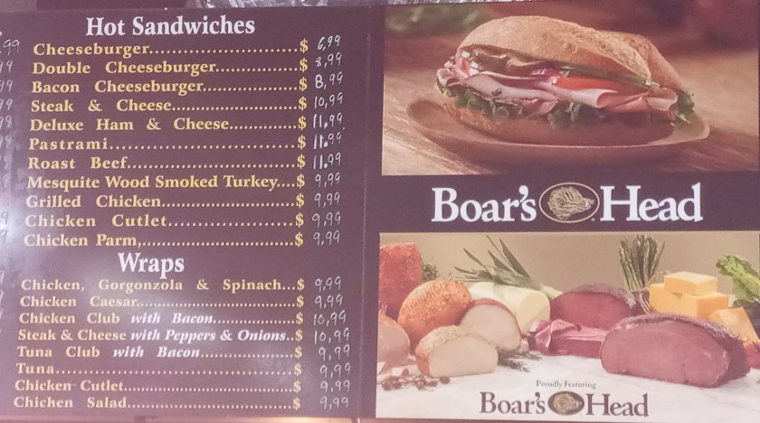 Here is the deli case with plenty of high-quality Boar’s Head meats and cheeses you can buy by the pound. (The prices are also on the menu board above.) The top shelf also includes sides of potato salad, pasta salad, egg salad, and some slices of cheesecake and red velvet cake, among other things.