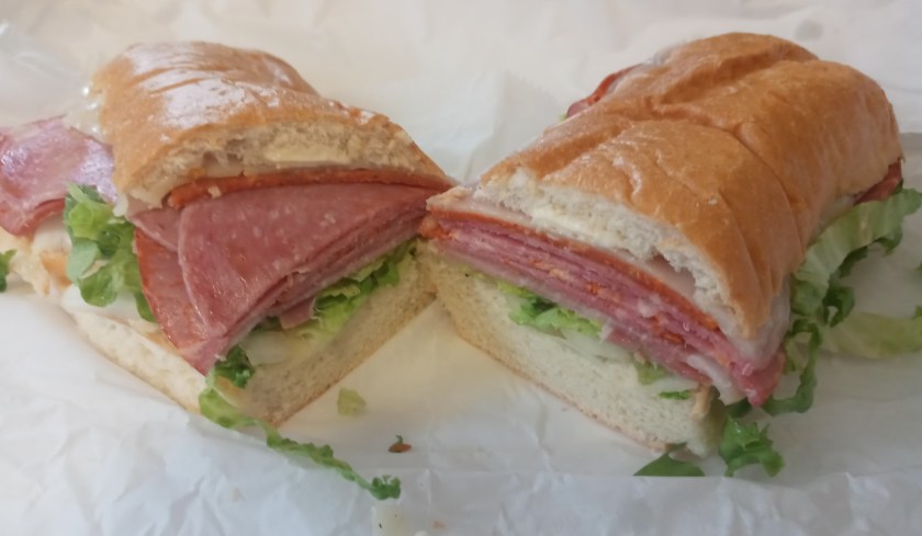 This was the very substantial Italian combo sub ($11.99), stuffed with Boar’s Head genoa salami, prosciutto, capocollo, provolone cheese, lettuce, tomato, and raw onion. I stuck it in the fridge as soon as I got home and enjoyed half that evening and the other half the next day, once it was chilled. I liked it a lot, especially once I got home and added some peppers and a splash of balsamic vinaigrette dressing to it. The sub roll was very soft, almost like a large hot dog bun. I don’t like rolls that are too crusty, but a slightly crustier roll might help bring this sub over the top. No regrets, though. I’m always happy to order an Italian sub anywhere, and I definitely recommend it!