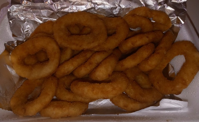 Longtime readers, my stalwart Saboscrivnerinos, know that whenever onion rings are available, I WILL order them. These onion rings ($3.99) were just okay. They reminded me of the ones at Burger King, but you get a huge portion of them. They were limp and lukewarm by the time I got them home, but heating them up in the toaster oven the next day helped them get crispier and more satisfying. Essentially, these were condiment delivery devices. But still, RING THE ALARM!