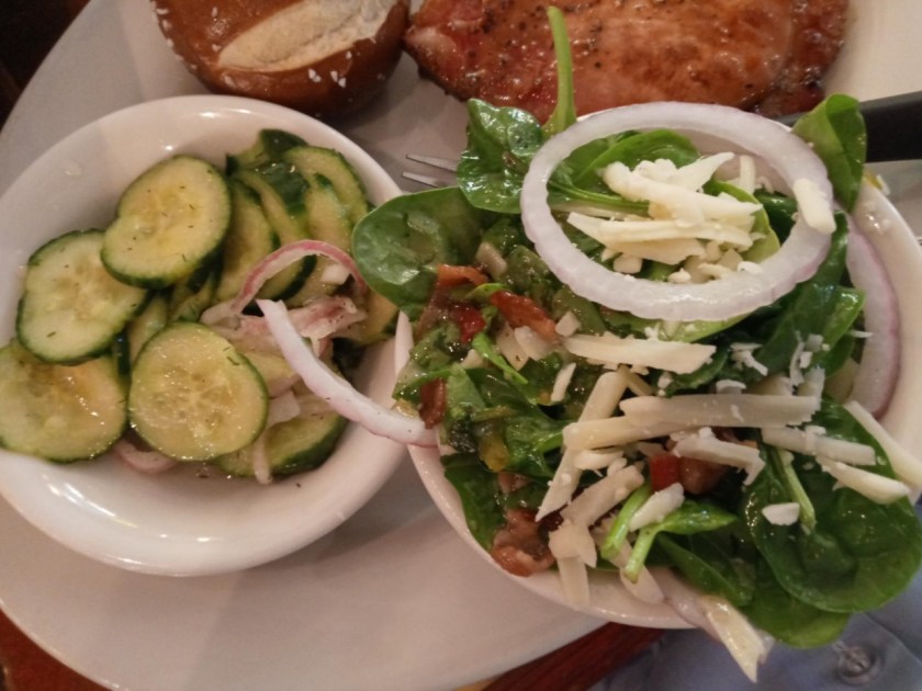 In addition to a little round pretzel roll, this time I broke my pattern and ordered two different, slightly lighter and healthier sides: vinegary cucumber and dill salat (so perfect to cut the richness of the pork chops, and also crunchy, cool, tangy, and sweet), and a wonderful wilted spinach salat with shaved gruyere cheese and warm sweet and sour bacon dressing. I shared both of these sides with my wife, and this one inspired her to start making spinach salads for herself at home, it was that good.