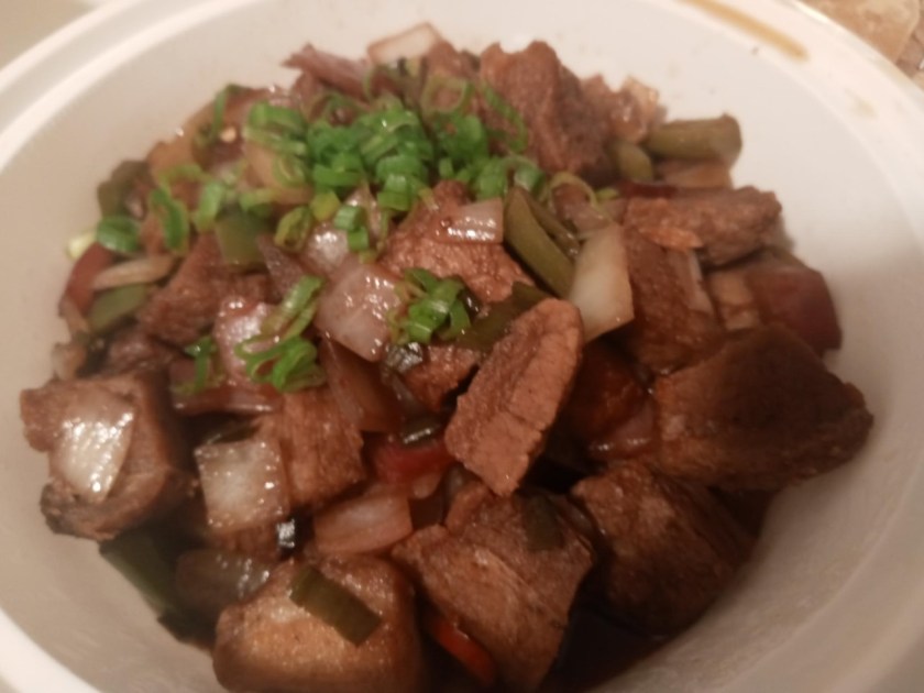 This is OverRice’s version of sisig, a Filipino dish of fried pork belly chunks tossed with onions and chilies in a soy and citrus sauce. I wonder if the citrus involved is calamansi, which are kind of like limes, but smaller and rounder, and with orange flesh inside. Regardless, the sisig was delicious. Totally different from the version I loved so much (and miss) from Taglish, which shows a wealth of variations in Filipino cuisine, which I am still learning about. I ended up stirring in some jasmine rice, which was included, but packaged in a separate container for my takeout order. The rice did a great job soaking up those incredible flavors.