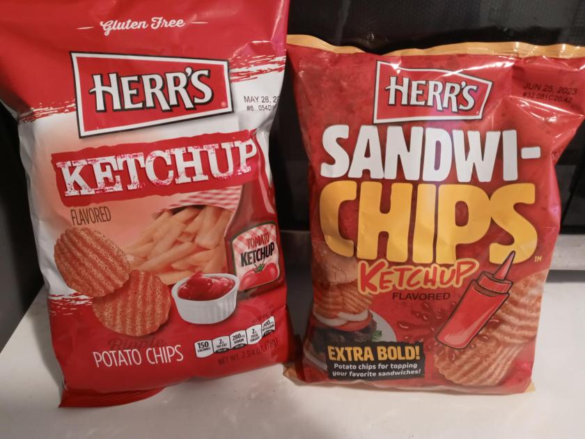 Anyway, to make this a truly scientific experiment (well, not really), I had to compare and contrast Herr’s original ketchup chips, which I’ve had several times, with the new Sandwi-Chips.