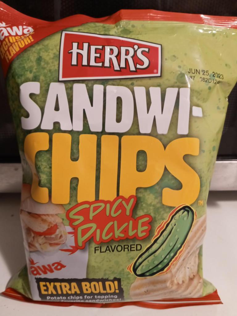 Finally (at least for these), Herr’s came out with a spicy pickle flavor of Sandwi-Chips, and they tasted very pickley, as one would expect and hope, but somewhat light on the spice.