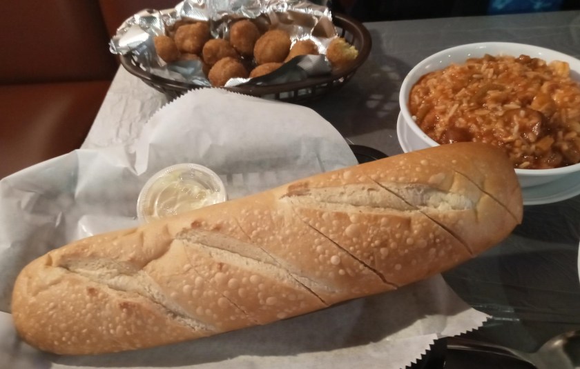 King Cajun Crawfish specializes in seafood boils, messy pots of excess featuring crawfish, shrimp, and crab in savory, spicy broths with potatoes, corn, and Andouille sausage.  However, those are so messy, you really have to dress down for a meal like that, or you’ll ruin your clothes.  Just an FYI: a meal like that might not be the best choice for a date, unless you’re planning to disrobe later, in case it could end up being an inspired choice.  My colleague and I played it safer, selecting with other menu items less likely to splatter, splash, and stain, but for future reference, those seafood boils are delicious, especially if you go with the house specialty “ShaBang sauce” (a blend of their traditional, lemon pepper, garlic butter, and “Rajun’ Cajun” seasonings).