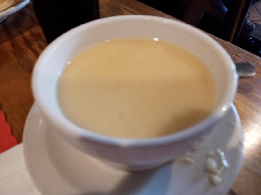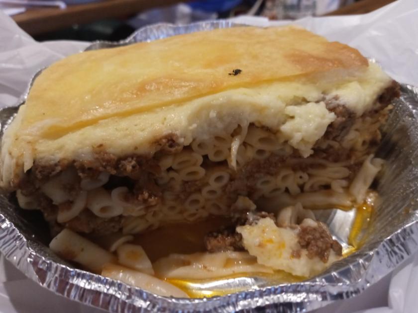 Since my wife doesn’t cook, I suggested she order something else that she could eat over the next day or two, once I was back at work.  She chose papootsakia, which is really fun to say.  The menu describes it as half an eggplant stuffed with seasoned ground beef topped with creamy Bechamel sauce and baked, but as you can see, it looks like they served her a double portion!  This was another banger.  We both tasted cinnamon in the ground beef, and I suspected they use the same recipe for the moussaka (casserole with ground beef, eggplant, potatoes, and Bechamel) and some other dishes.  My wife named this one of the best things she has ever eaten in her life, and she doesn’t toss around superlatives as freely as your friendly neighborhood Saboscrivner!Needless to say, the papootsakia (hehe) lasted her a few days, and like so many saucy, savory dishes, it kept tasting better and better after every day in the fridge.