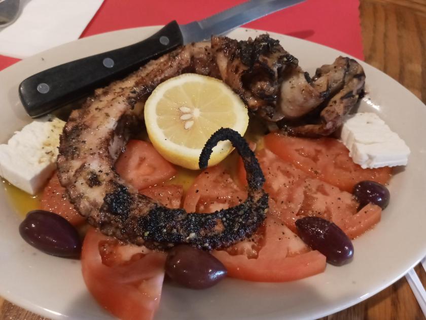She chose the octopus from the list of mezethakia, or Greek appetizers, to be her main course.  We all have our favorite dishes we can never turn down when we see them on menus, and octopus is one of hers.  You never know quite how restaurants are going to serve it, but Zorba’s served one large, marinated, char-grilled tentacle with tomatoes, kalamata olives, lemon, and some of the best feta cheese either of us have ever had.  I’ve had so much rubbery, chewy octopus that I don’t seek it out anymore the way she does, but she insisted I try it, and it was outstanding — easily some of the best I’ve ever tried anywhere.  Really meaty and flavorful, possibly from being tenderized by an acidic marinade that includes vinegar.