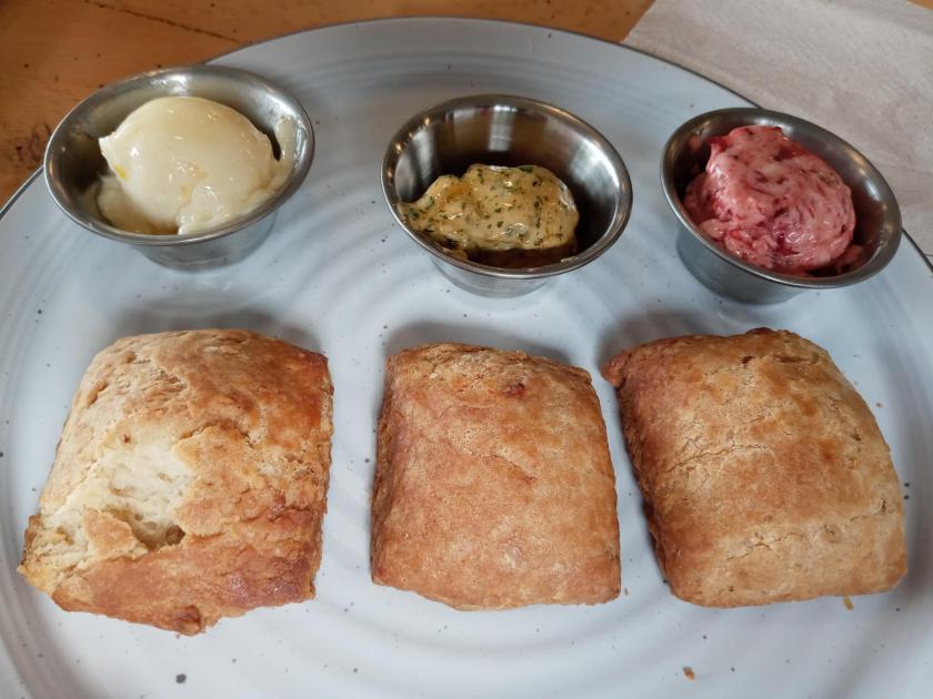 And from the brunch menu, my wife really wanted to try the biscuits that came with a trio of different flavors of soft, spreadable butter. It looks like they change these flavors all the time, but today we got mango, cilantro-jalapeño, and strawberry-basil butters. My wife really loved the two fruity ones, and I liked all three. The biscuits weren’t huge, but we also shared my cornbread and still had plenty of these rich, creamy, velvety butters left to bring home in the tiny plastic sauce cups. Thank goodness for the lids!
