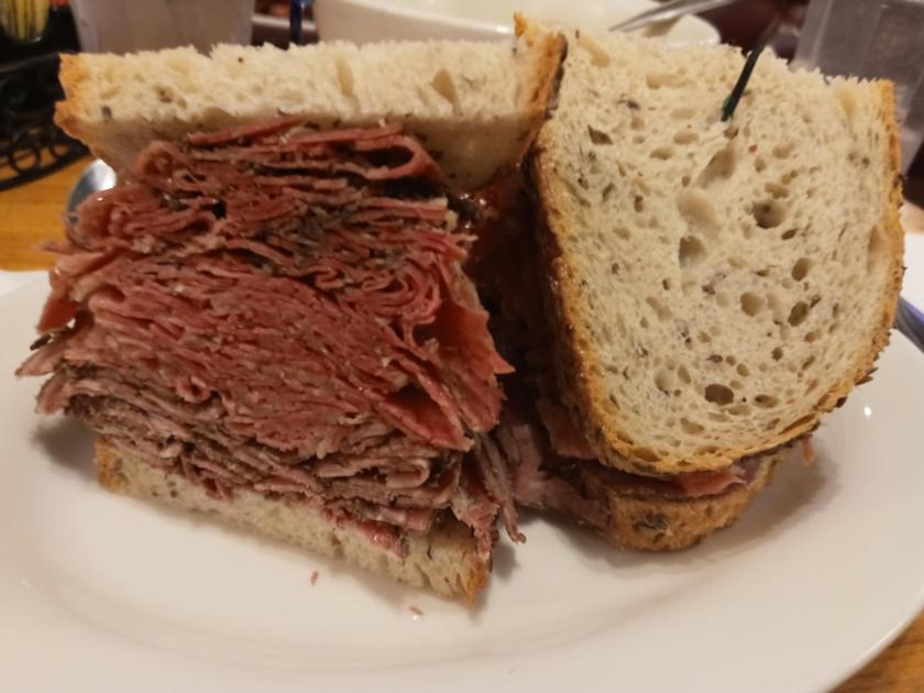 As great as my Arthur Avenue adventure was (spoiler alert!), my single favorite meal on this latest NYC trip was Sarge’s Delicatessen and Diner (https://sargesdeli.com/), and not just because I was back with my wife after a day apart from her, mostly spent waiting in long lines with fellow nerds.  Sarge’s is located in Manhattan’s Murray Hill neighborhood and first opened in 1964 — not as ancient as Katz’s Delicatessen, but still an impressive run.  You will see why shortly.