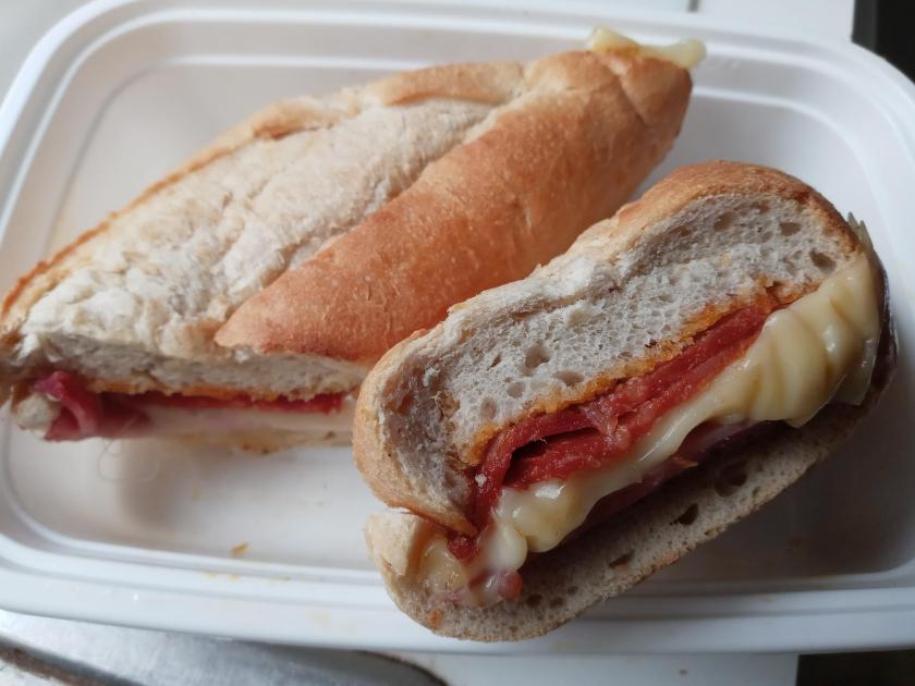 I also tried the Vicky sandwich, with thin-sliced cantimpalo sausage (similar to pepperoni or spicy salami), sweet ham, Swiss cheese, and butter on a French baguette — a more continental sandwich.