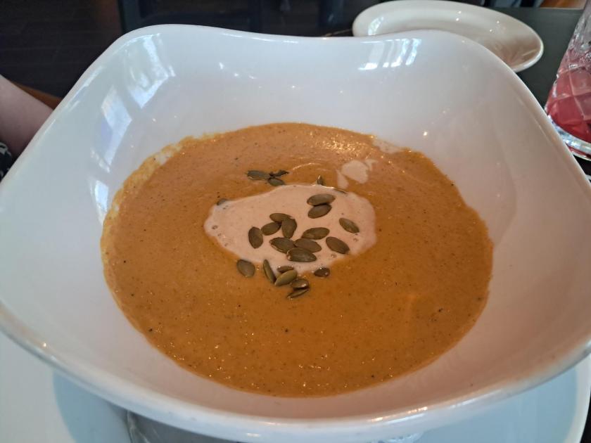 My wife loves winter root vegetables, so she was very tempted by the butternut squash bisque, even though it wasn’t one of the Magical Dining options. Since we are a fun couple who know how to party, she went for it. The bisque was thick, rich, creamy, savory, and slightly sweet, and that is whipped cream and some toasted pepitas in the center. It was a perfect soup for the fall (by which I mean the season, but it would also be a comforting soup to take the edge off the end of civilization).