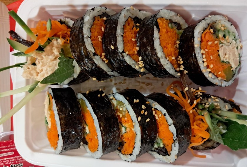 I have had a never-ending tuna craving, so I ordered tuna gimbap to start with. Gimbap looks superficially similar to a sushi roll: various ingredients rolled and wrapped in sesame oil-seasoned rice and a layer of dried seaweed — very similar to Japanese nori — and then sliced. The tuna gimbap included a mayo-based tuna salad, finely shredded carrots, cucumbers, sesame leaf, and sesame seeds. It was a fine little snack, but I couldn’t complain about getting too much tuna. If anything, it was too much carrot and not enough tuna! This gimbap didn’t quite scratch the tuna salad itch I’ve had since having the best tuna sandwich ever on my last trip to Los Angeles, which also included some Korean flavors.