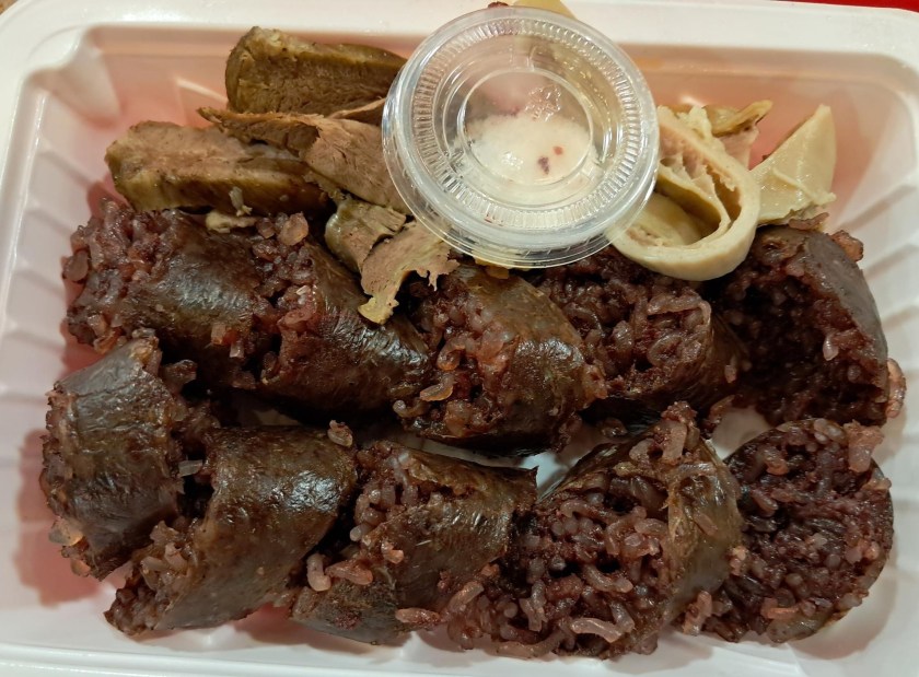 The thinly sliced, light-colored meat in the top right of the sundae tray is intestine, but I’m not sure if it was beef or pork. I ate it, and it was fine, but I’ve enjoyed grilled intestines at Argentinian and Korean restaurants before that ended up with a more pleasant crispy texture from the grilling process.