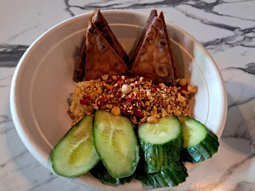 My wife is obsessed with hummus, especially since our recent discovery of The Hummus Guy food truck. Aside from the dogs and the proximity to her stylist, the other reason I suggested Barkhaven was because I saw they serve hummus, and I knew she would want to try it. It’s a very nontraditional hummus, though — mixed with balsamic red peppers (I loved ’em, she didn’t), topped with crushed crispy chickpeas (not sure if they were dehydrated or fried in beef tallow?) and paprika, and served with thick-sliced cucumbers and pita chips (definitely fried in beef tallow, maybe a moment too long).