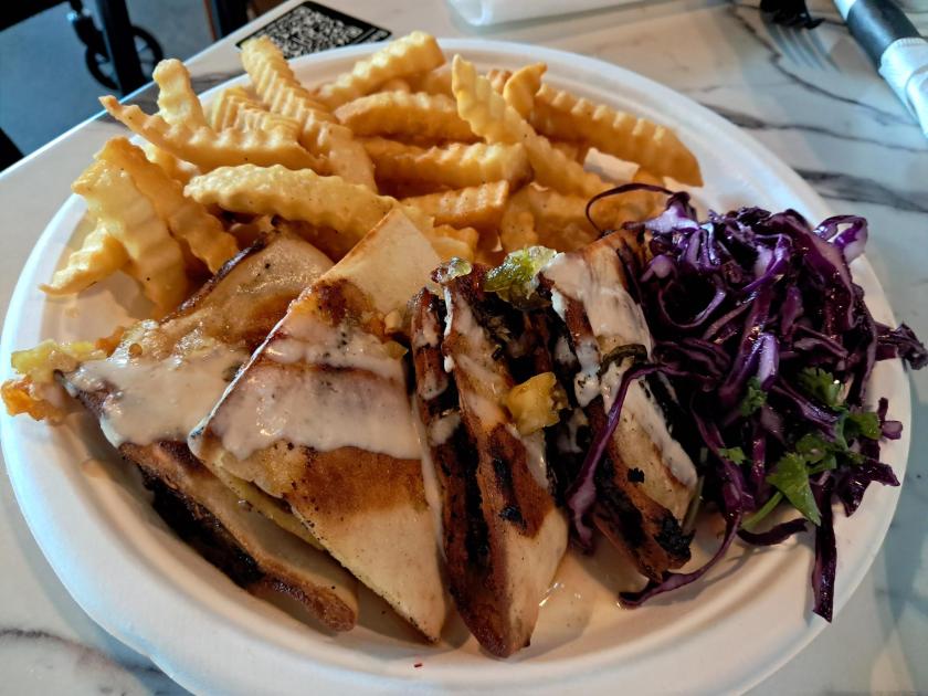 This was definitely the best thing I tried at Barkhaven, the arayas, also known as a Lebanese burger. Rather than a traditional burger patty that might just be sprinkled with salt and possibly pepper, this beef was heavily seasoned with delicious spices, and it actually had some heat, which I enjoyed. It was stuffed into a pita and grilled to get a crispy exterior, then drizzled with garlic tahini and rosemary pineapple hot honey. It was terrific — savory, spicy, and so messy and greasy. It reminded me of a spicier, greasier, messier version of the hawawshi I enjoyed so much last summer at The Cairo Express, although that was crispier because it didn’t have any condiments or sauces on the exterior surface.