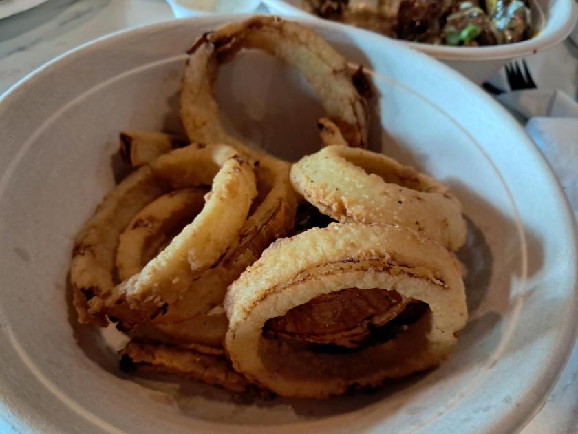Even though I’ve been eating less and eating healthier (this meal being an exception), and even though I didn’t devour all the fries, I saw Barkhaven offered onion rings, so I had to try them. I try onion rings anywhere and everywhere, since I have a recurring feature on this food blog called Ring the Alarm! These were described as “Thick-cut onions dipped in a crisp, golden beer batter and fried to perfection,” but they were not the kind that I am always delighted to find in the wild, at restaurants like The Whiskey, Christo’s, Build My Burgers, bb.q Chicken, and even Culver’s. The batter on these was dry, kind of tasteless, and had several burnt, scorched spots. Maybe it was the beef tallow.