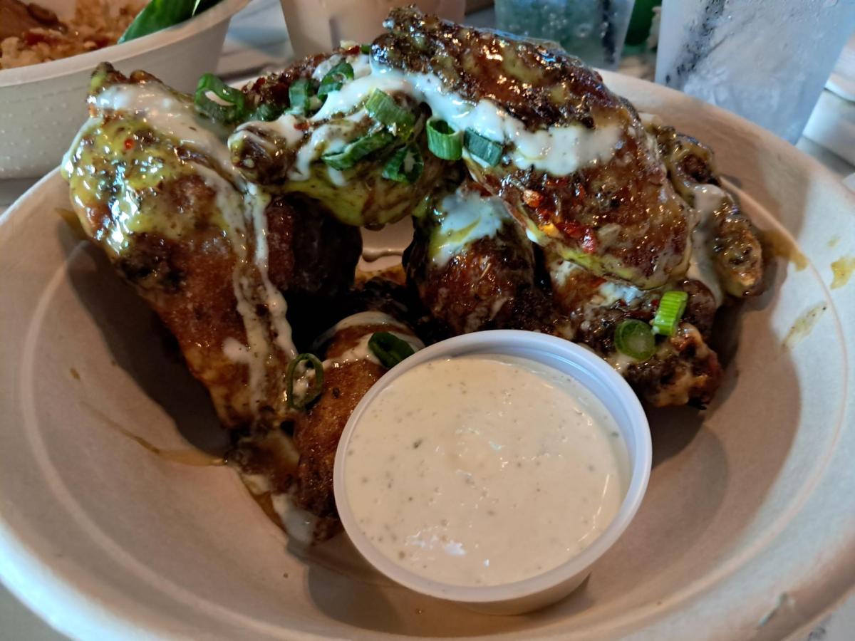 The crunchy red cabbage slaw on the side was pleasant, even though I usually prefer the creaminess of conventional cole slaw. And I didn’t realize this arayas was going to come with fries, but I’m trying to be good and avoid fries. These were pretty conventional crinkle-cut fries, despite the beef tallow, so I wasn’t terribly tempted. I dipped a few in the ranch that came with the wings and dragged a couple through whatever tahini, honey, and meat juice dripped out of the arayas, but I left most of the fries behind and only felt a little guilty about the unexpected food waste.