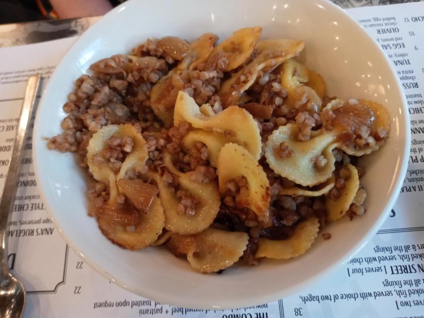 My regular readers know how much I love delis, especially all the smoked, cured, and pickled meats and fish. I saw a whitefish salad sandwich on the menu ($10) and had to have it. Whitefish is a large fish that is often smoked whole, until the skin turns a beautiful golden color. Then the flaky, oily, smoky flesh is scooped and scraped out, mixed with mayonnaise, dill, usually chopped celery, and other herbs and spices. I just love it, and I’m already overjoyed on the rare occasions I can find a whole smoked whitefish or “chub” in a store and make my own whitefish salad. But it’s a labor-intensive process, making sure to remove all the inedible hair-thin bones that look like clear plastic and can really get caught in your throat. That’s why it is even more pleasing when the professionals do the work. This was delicious whitefish salad on the same kind of soft seeded roll — big chunks of fish mixed with mayo (Duke’s!) and lots of dill. It was topped by crispy “celery salad,” with long, paper-thin strands of celery and red radish that must have been sliced with a razor-sharp mandoline slicer. They topped it with a slice of muenster cheese too, almost making it like their version of a tuna melt, that diner classic. Of course the sandwich was served cold, as it should be.