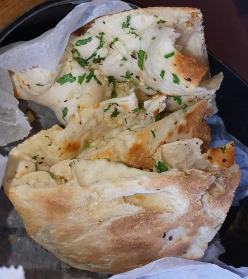 Speaking of which, since I wasn’t expecting the pav to be familiar buns, I also ordered chilli naan ($4), the soft, warm, fresh bread baked in a clay tandoor oven, that goes so well with any Indian dishes.  For some reason, I was expecting it would be stuffed or covered with chunks of spicy peppers, maybe cooked or maybe pickled, but it was just sprinkled with dried chili flakes, like what I often shake onto pizza.  Still, it was great naan.