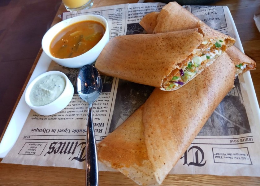 But wait, there’s more!  My one friend ordered the masala dosa ($9), a gigantic, crispy rice crepe stuffed with yellow curry-spiced potatoes and curry leaves.  It’s hard to get a sense of scale, looking at this thing, but this dosa is the kind of thing that would draw everyone’s attention in the dining room when a server walks it out to your table.  I quote the great thespian Jason Statham in the 1998 Guy Ritchie film Lock, Stock, and Two Smoking Barrels: “It’s as long as my arm.  I wish it was as long as something else!”We all pulled pieces off this colossal crepe, and dipped our divided dosa in a lentil-based vegetable curry called sambar, along with coconut chutney (in the smaller cup).  No double-dipping was done.