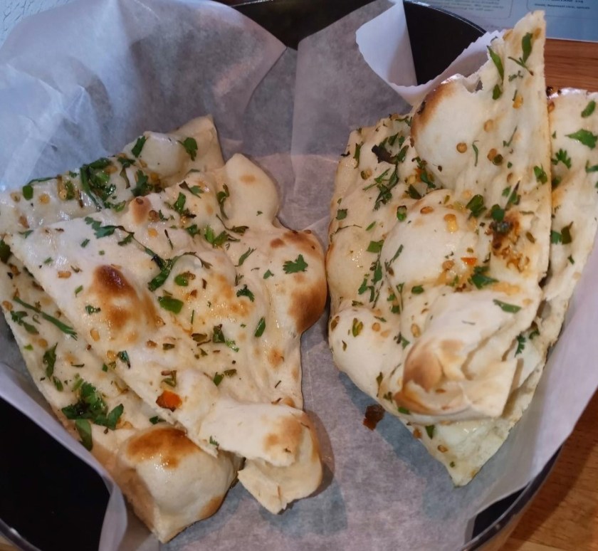 I had to order onion-garlic naan for us to share ($4), and it went so well with the xacuti and the other sauces we shared.