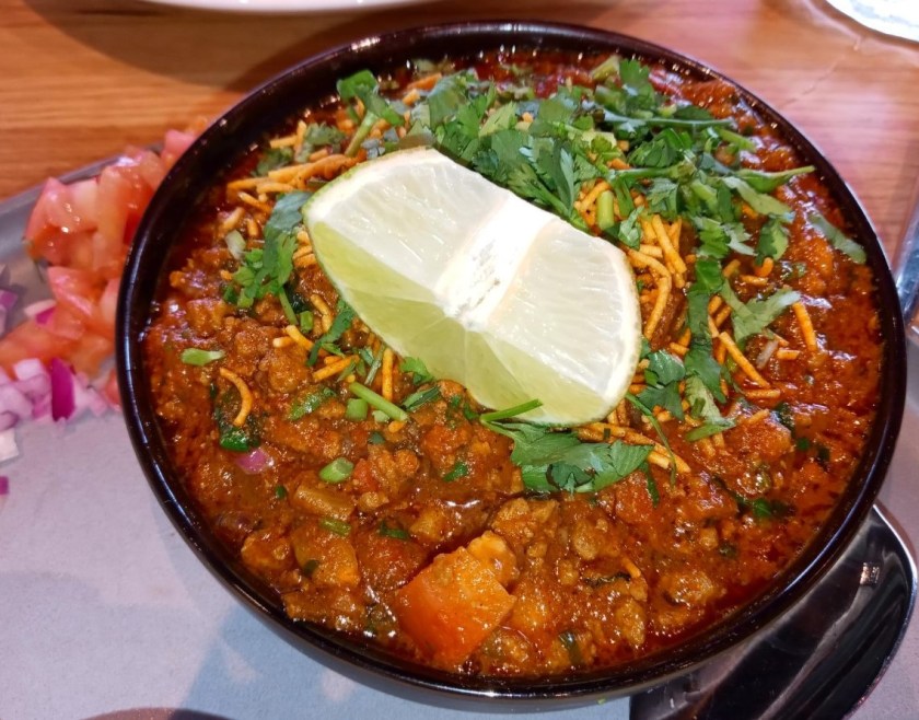 The pav bread was like perfect little hamburger buns with smooth, shiny crowns, the ideal size for sliders.  The cut sides were lightly grilled (as all good burger buns should be) and dabbed with what looked like a cilantro-mint chutney (the green sauce) and another sauce that was really good.  The minced lamb was served as a spicy chili, not that different from the chili I love to make at home the minute Florida temperatures dip below 70 degrees.  As much as I love to cook with ground lamb, I’ve never used it in my chili before, worried that the unique gamey flavor of lamb would get lost amid the tomatoes, onions, peppers, and spices I use.  This wasn’t the same familiar chili or sloppy joe recipe most Americans would know, but it was a comparable dish, and the lamb flavor came through.  This picture is much prettier than what my assembled “sloppy joes” would eventually look like., but they were so delicious and fun to assemble.  Looking it up later, I learned that “pav” just means bread, but it comes from the Portuguese word “pão” for bread, since Portuguese explorers (colonizers) brought their bread recipes to India.  I have enjoyed all the Indian breads I’ve tried before — naan, roti, parathas, and kulcha — but pav was completely new to me, and yet completely familiar.