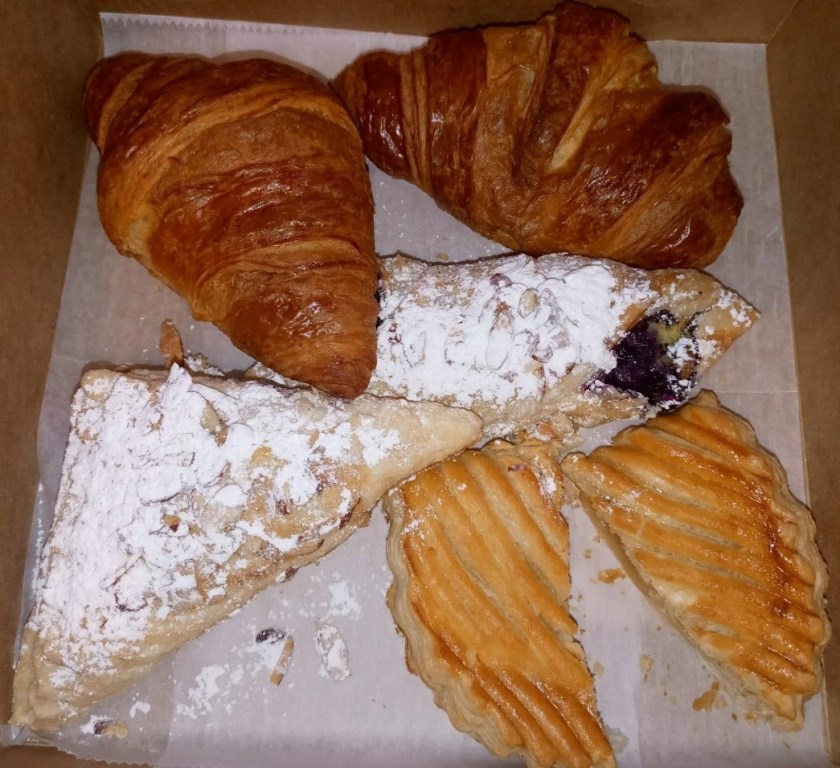 In addition to the two plain croissants, my wife picked an almond croissant ($3.99; the triangle in the bottom left), I got a blueberry pastry ($3.99; center), and we split the gorgeous apple turnover ($3.69; cut in half in the bottom right). The turnover was magnificent, but I still give the plain croissants the nod for being the best in this box. The other two pastries were fine, but they look like they’ve been partying in Miami, don’t they?