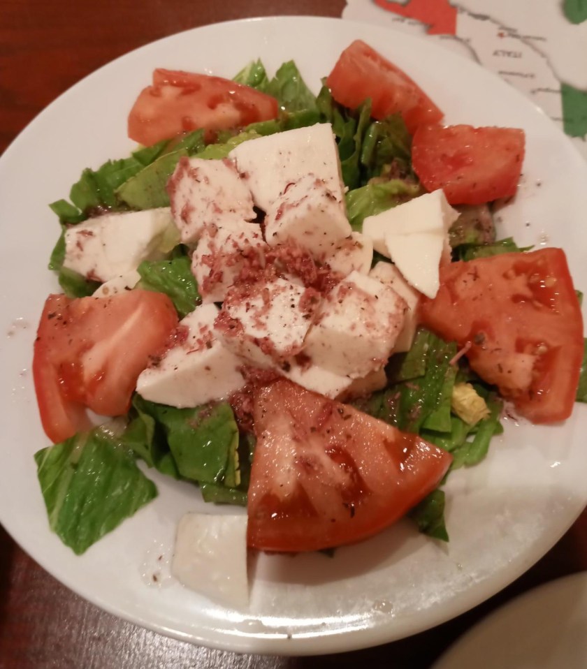 One of my colleagues ordered the tri-color salad with romaine lettuce, tomatoes, and fresh mozzarella, topped with the same house dressing.