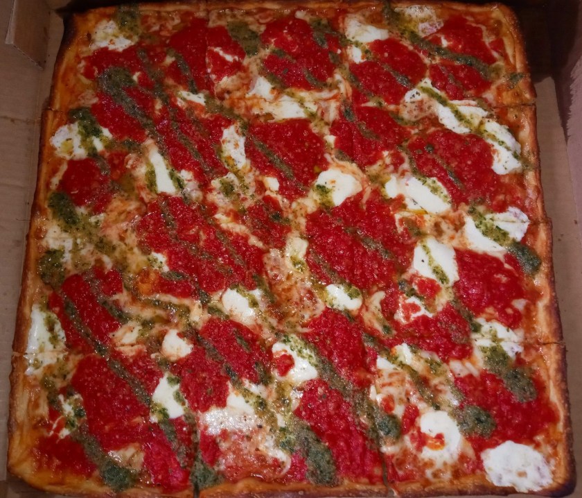 And after trying the thin crust Grandma Sicilian last time, I had to go back for the thicc Brooklyn Sicilian this time.  I would have settled for a slice, but they didn’t have any Sicilian slices left, so I sprang for a whole pie, knowing I’d make it last over several days.  It started out with twelve slices, but I HOUSED three of them before remembering to take this photo.  I loooove Sicilian pizza, you guys.  I used to get slices at Cozzoli’s Pizza in the Dadeland Mall food court in suburban Kendall as a kid, and that’s how my love affair with rectangular, pillowy-soft, crispy-edged  Sicilian pizza started, in the early ’80s in Miami.