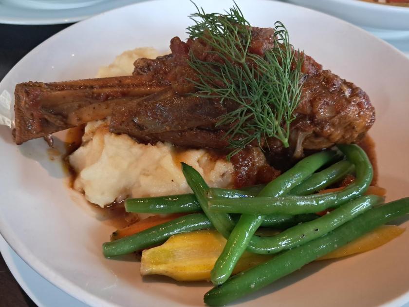 So instead I chose one of my favorite meals, a braised lamb shank.  This is one of my favorite things to eat in the world, and I love ordering them at Turkish and Greek restaurants.  In fact, I love braised lamb shanks so much that I learned how to make my own in a rich, thick sauce of crushed tomatoes, onions, roasted red bell peppers, and hot cherry peppers.  My sauce takes on so much rich lamb fat, and it makes a perfect pasta sauce that lasts for days after all the meat is gone.  I usually braise mine for five to six hours until the meat is literally melting off the bone, but I could tell this lamb shank wasn’t cooked quite as long, since it held its form better, clinging to the bone.   It was tender and unctuous in its own tomato broth, and I tasted cumin as the main flavor in there.  it was served on a bed of mashed potatoes (not mashed sweet potatoes this time), with haricots verts and fresh dill on top, and it was lovely.  I ate most of this dish at home the following day, since another distraction arrived at the same time.