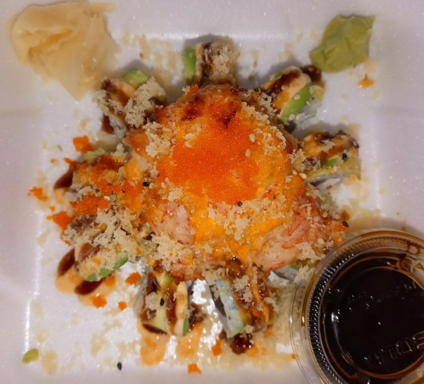 This was the “crazy” California roll, topped with spicy surimi krab, in addition to the krab, avocado, and slivered cucumber inside. I’m a sucker for surimi and anything spicy, so I enjoyed this, even though I never order California rolls.
