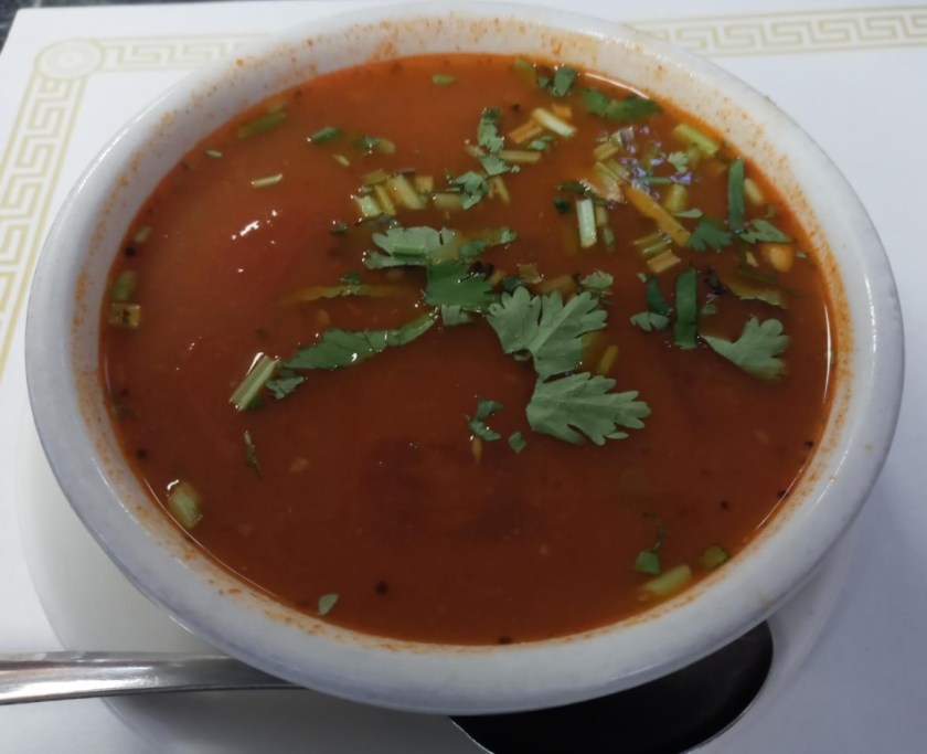 I don’t even remember ordering this, but it is a soup called rasam, described on the menu as “Traditional South Indian Sour’n Spicy Soup.”  The sour ‘n spicy aspects would have appealed to me, especially since I was ordering several carb-heavy dishes to come.  It is made with tomatoes and tamarind and garnished with chopped cilantro leaves.  I think I got it planning to dip the various baked and fried breads in it, not realizing that they would come with their own li’l dipping cups.