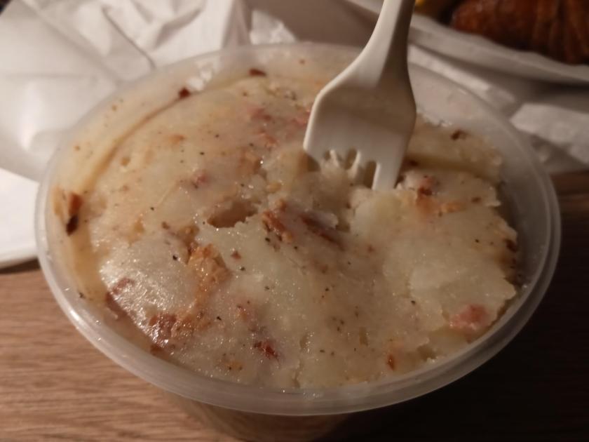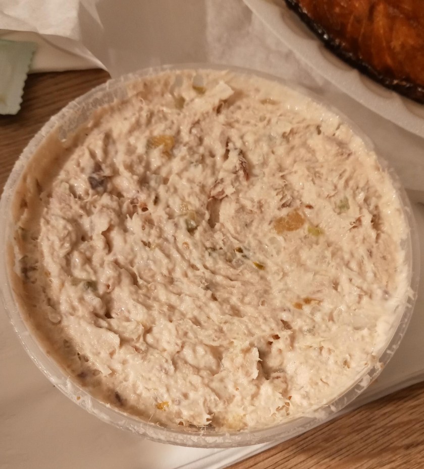 Unlike the salmon, you can’t eat the scaly skin of the mullet (the entire underside), so I did what I could to peel it all off, along with the tail, fins, and all those bones. The little sauce containers were a creamy horseradish sauce that had a slight sweetness (not nearly as intensely spicy as the horseradish sauce at Orlando’s beloved Beefy King) and another sauce that was seemingly ranch (that one was for the Swifties), but possibly with some Cajun seasoning added. I brought those home as well and added them to the flaky, deboned mullet (because the meat is also drier than the smoked whitefish I’m used to).