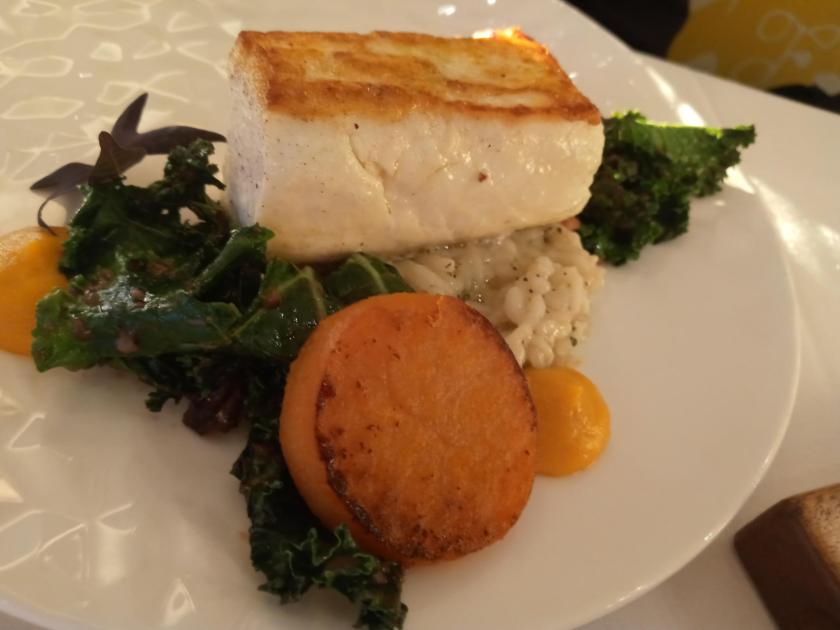 My wife chose the seared halibut for her entrée… just for the halibut. I don’t mind calling it a main course, but I don’t like “mains” on a menu and I especially don’t like “proteins.” This lovely seared rectangular prism was served atop bourbon-brown butter risotto with a slice of fondant sweet potato, sweet potato purée (fine dining chefs also love their purées), sweet potato leaves, kale (she has been on a kale kick ever since that dinner), toasted pecans, and a cranberry vinaigrette dressing.