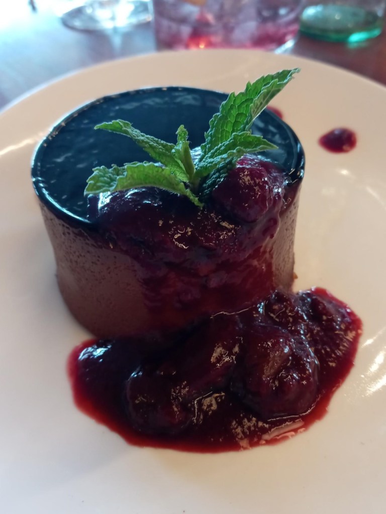 My wife is much more of a dessert person than I, but I made my choice to go with two apps instead. Nothing would sway her from the chocolate fudge layer cake, drizzled with chocolate sauce and topped with a dollop of whipped cream, a buttery, shortbread-like cookie, and a Pirouline rolled wafer cookie filled with chocolate or hazelnut spread. Like everything else in this glorious epic dinner, the presentation was stunning, and she said the cake itself was superb. She brought about half of it home and said it was even better — even more moist — after a night in the fridge!